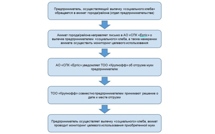 В рамках реализации механизмов стабилизации цен, АО «СПК «Ертiс» через партнера ТОО «Крупнофф» осуществляет продажу муки пшеничной 1 сорта для выпечки «социального» хлеба (хлеба пшеничного из муки 1 сорта формового) по цене 130 тг/кг. Для приобретения муки вам необходимо обратиться в акимат города/района (отдел предпринимательства) для получения письма об осуществлении соответствующего вида деятельности, а также намерения акимата осуществить мониторинг целевого использования приобретенного объема муки. После получения указанного письма, необходимо обратиться к уполномоченному представителю ТОО «Крупнофф» (+77778581818) для согласования времени и места отгрузки.